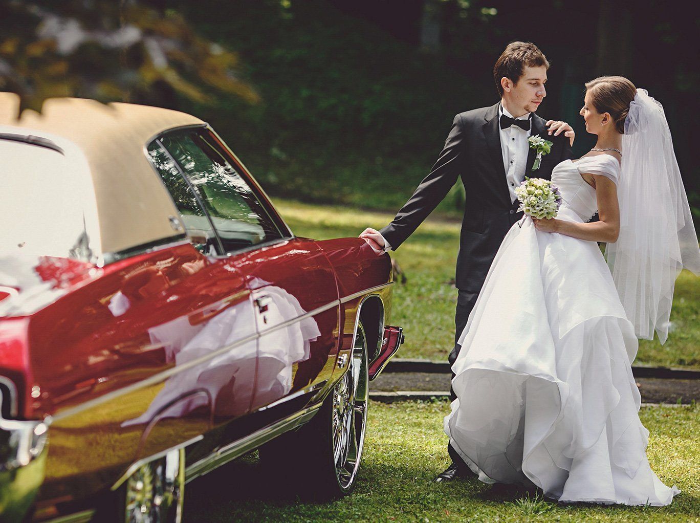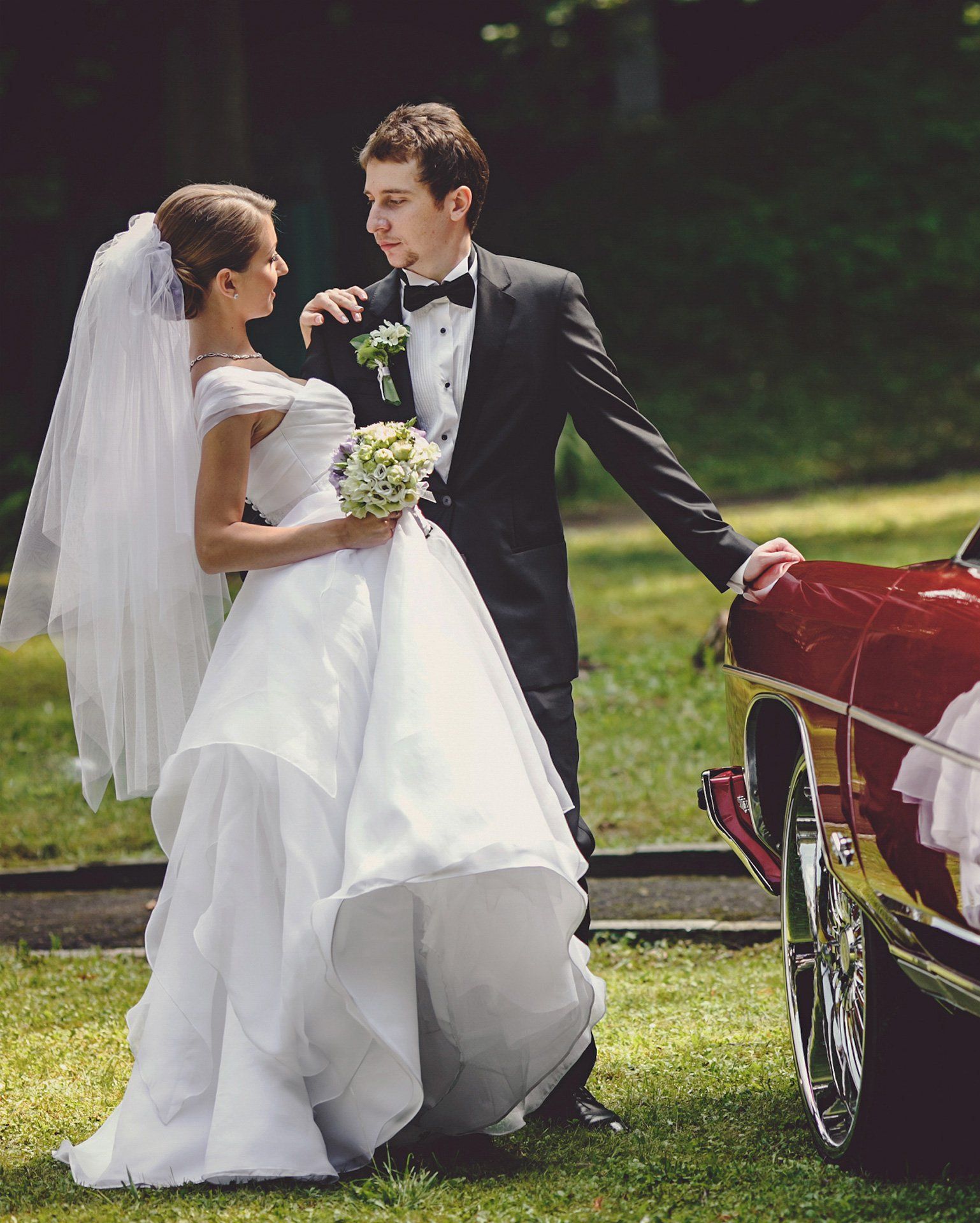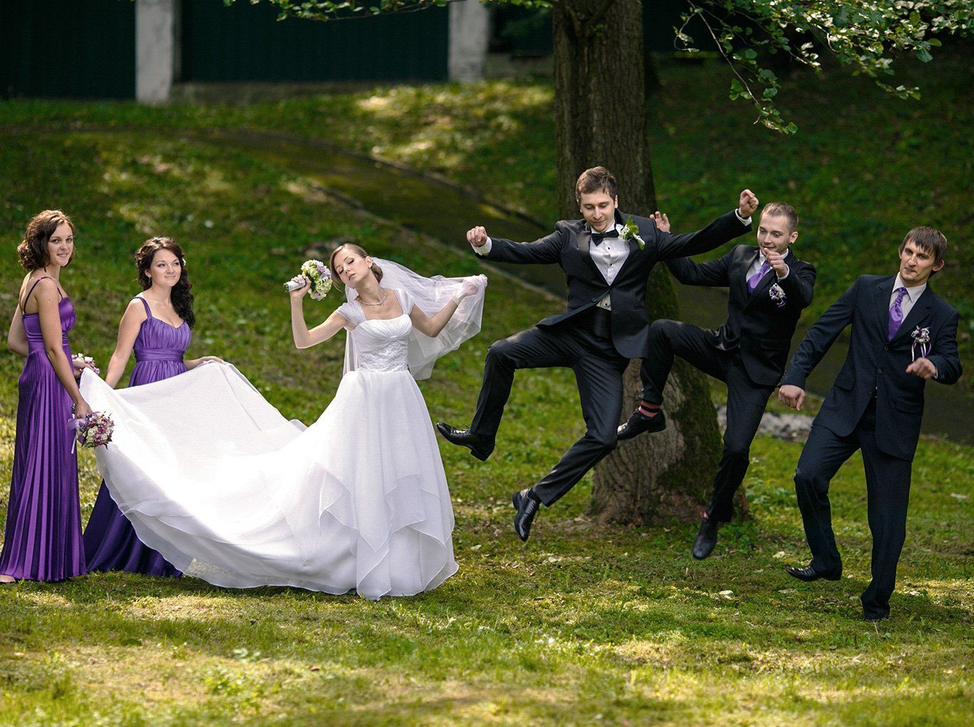 Maria et Terry étaient très à l’aise et naturels face à l’appareil photo, et ils nous ont impressionnés par la précision avec laquelle ils suivaient nos conseils. Cela nous a permis de faire de magnifiques photos : leur amour mutuel est éblouissant. Nous avons également réussi à immortaliser le couple avec ses demoiselles et garçons d’honneur : le vert feuillage du paysage faisait particulièrement bien ressortir le beau violet des robes.