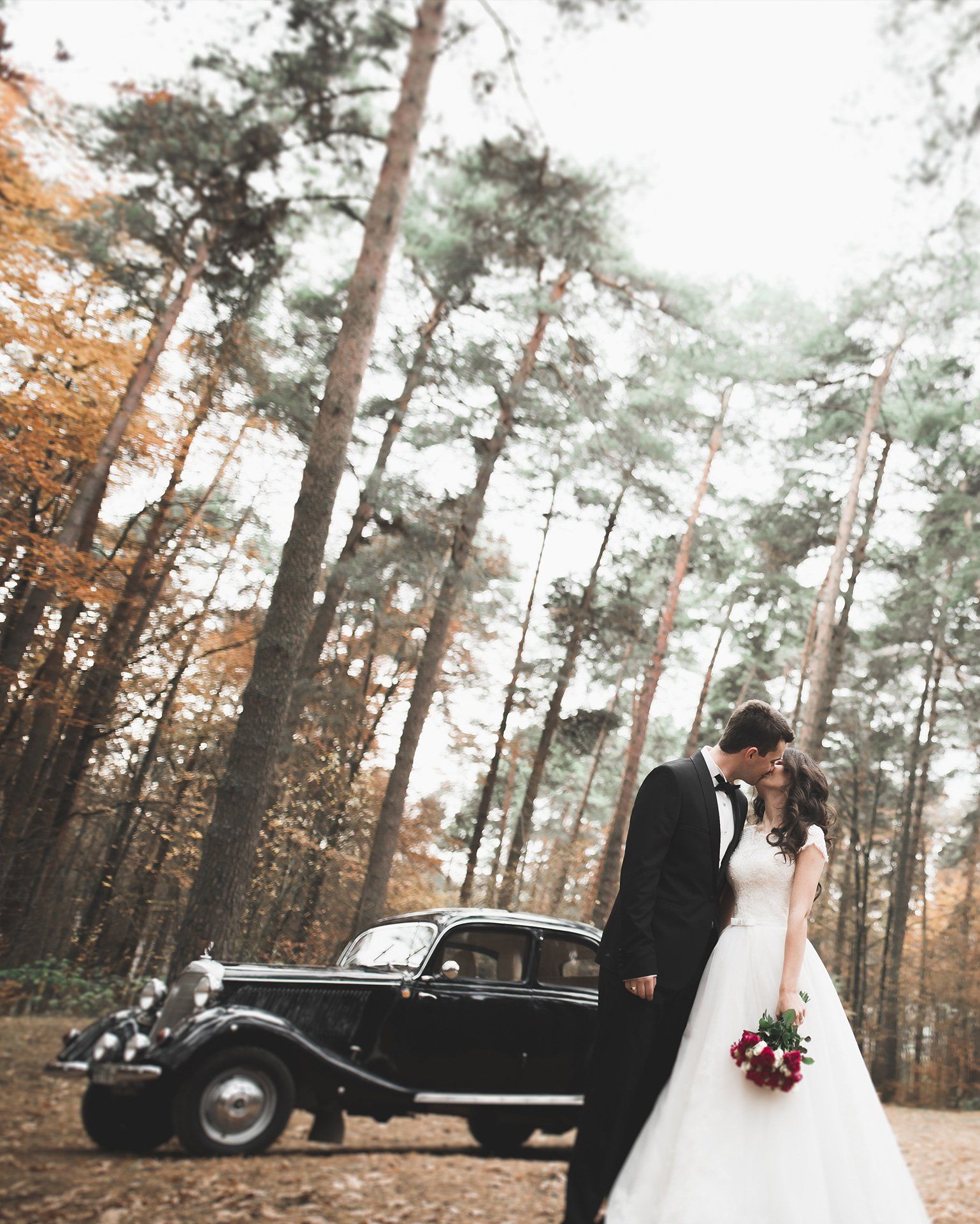 Pendant que les invités se délectaient de champagne et de savoureux canapés, nous sommes partis avec le couple afin de prendre de belles photos. La mariée brillait dans sa magnifique robe à lacets, et la voiture rétro en arrière-plan donne un air encore plus authentique à la photo.